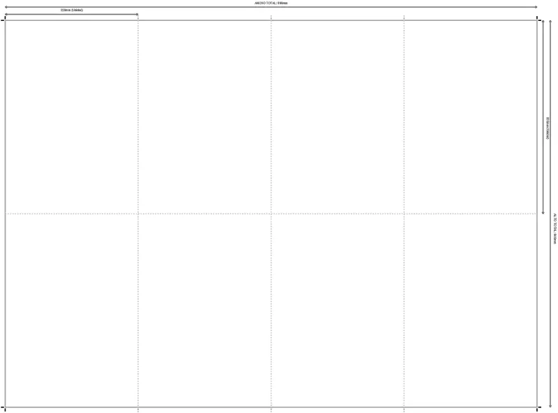 Esquema de hendidos: Dos hendidos paralelos al alto de la publicación. Primer hendido a 22 cm desde el borde izquierdo del pliego. Segundo hendido a 44 cm desde el borde izquierdo (o 22 cm desde el primer hendido). Esto crea tres paneles de 22 cm de ancho cada uno.